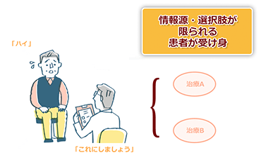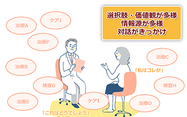 医療の情報源や治療の選択肢が限られていた時代は、患者さんは、医療者の勧めに従うだけの「お任せ医療」で選択に困ることはあまりありませんでした。しかし現在は、検査の内容、治療法やその後のケアも含めて多くの選択肢があり、患者さんの価値観も多様です。治療に対する考え方も異なり、治療内容に注目する方、治療後のケアや生活を重視する方などさまざまです。多くの情報源をもとに、患者さんから提案や質問をすることも多くなってきました。このような状況から、患者さんと医療者が対話を通じて、お互いにわかること・わからないことを「話し合う医療」が重要になっています。