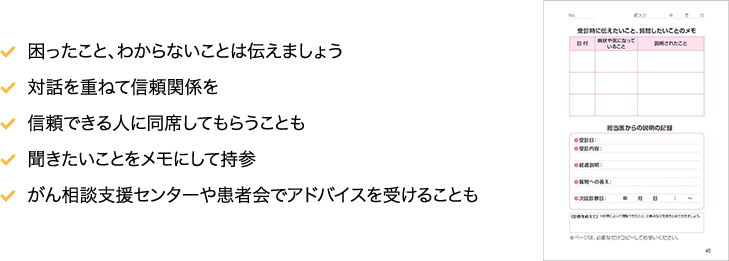医療者は、患者さんやご家族の不安や疑問を知りたいと思っています。それがわかれば、みんなでサポートする仕組みや体制がとれるため、困ったことや、わからないことはためらわずに伝えることが大切です。受診の時に、伝えたいことや質問したいことのメモを持参すると助けになります。伝えるタイミングは、いつでもよいですが、早い時期のほうが選択肢は広くなります。不安や疑問を伝えることによって、自分の考えがまとまったり、次のステップにつながることもあります。また、対話を重ねることで医療者との信頼関係も強くなります。