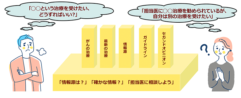受診先の医療機関以外にも、「がん相談支援センター」の相談窓口や患者会・患者団体などでも相談したり、アドバイスを受けることができます。