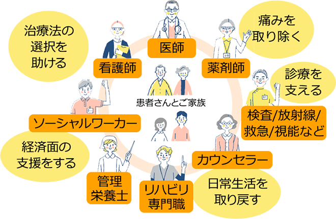 患者さんやご家族の支援にあたっては、治療から療養生活に至るまで、総合的にチームで行います。担当医だけではなく、看護師、薬剤師、ソーシャルワーカー、管理栄養士、リハビリ専門職など、それぞれの分野の専門家がチームとなってサポートします。生活面を含めて、心配なことがあればスタッフに伝えることが、ご自分のためにもなります。