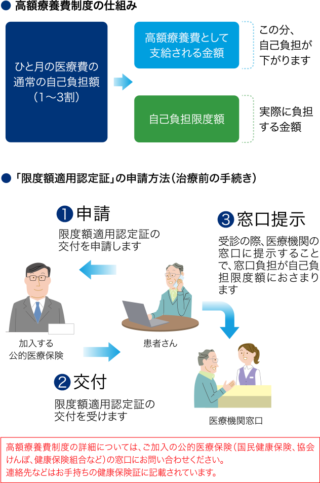治療を開始する前にご加入の公的医療保険の窓口に「限度額適用認定証」の交付を申請し、受診の際、医療機関の窓口にこの認定証を提示することで、自己負担額が自己負担限度額までとなります。