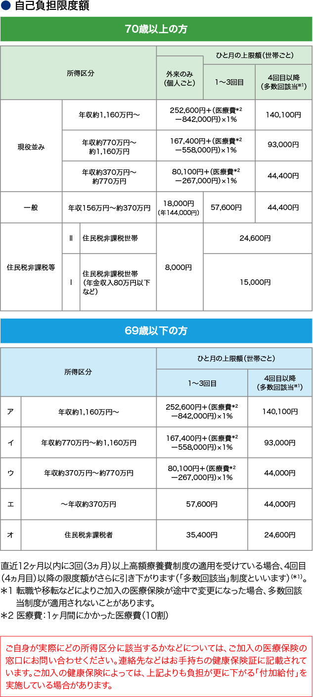 患者さんの年齢、所得の水準によって自己負担の限度額は変わります。