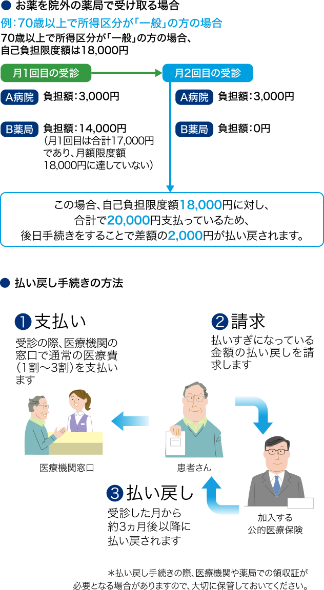 1つの医療機関の自己負担では上限額を超えないときでも、医療機関での支払いと薬局での支払いを合算して、高額療養費制度の適用を受けることができます。
