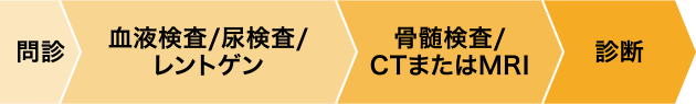 多発性骨髄腫の診断では、まず問診や一般的な血液検査、尿検査、レントゲン撮影を行い、血液の病気を疑う異常や合併症がないか確認します。検査の結果、多発性骨髄腫である可能性が高いと判断された場合、骨髄検査や画像検査など、さらに詳しい検査を行います。