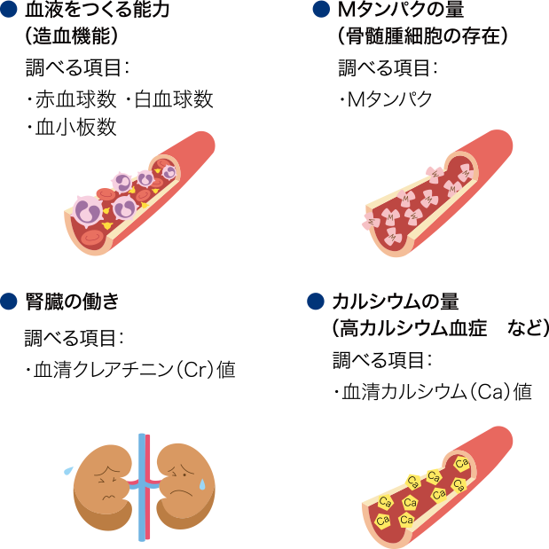 正常な血球が減っていないか「血液をつくる能力(造血機能)」や、がん細胞がつくり出した異常なタンパクが血液の中で増えていないかなどの「骨髄腫の進行度」や「腎臓の働き」を確認します。