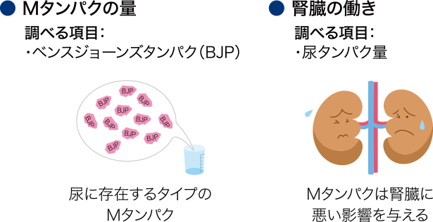 本来からだの外へ出ることがないタンパクや、がん細胞がつくり出した異常なタンパクが尿の中に増えて、腎臓の働きに障害を与えていないか確認します。