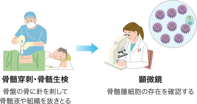 血液検査や尿検査の結果、多発性骨髄腫の可能性が高いと考えられる場合に行います。腰の骨に針を刺し、骨髄液を取り出して、顕微鏡でがん細胞の存在や形を確認します。