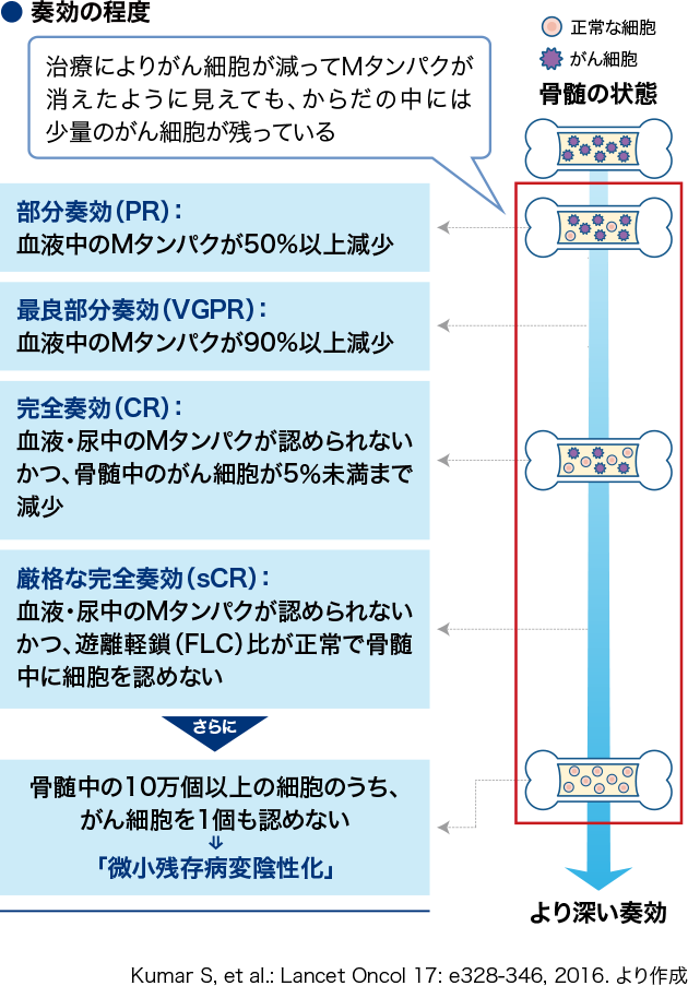 治療によりがん細胞が減ってMタンパクが消えたように見えても、患者さんのからだの中には少量のがん細胞が残っています。この残ったがん細胞のことを「微小残存病変」といいます。