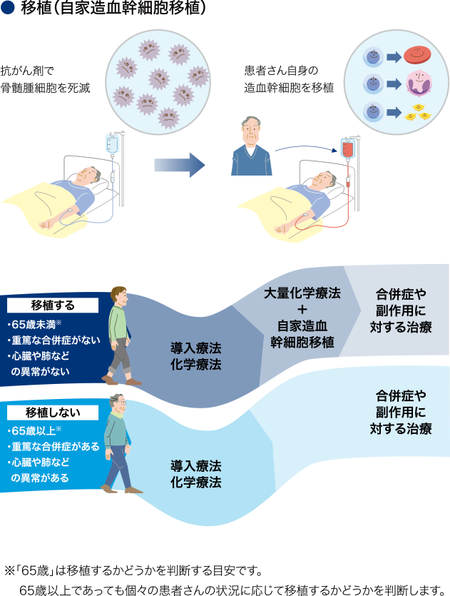多発性骨髄腫の治療の中心は薬物療法と自家造血幹細胞移植で、主治医は患者さんの年齢や合併症の程度、心臓や肺の機能などを基準に、どんな初回治療を行うかを判断します。