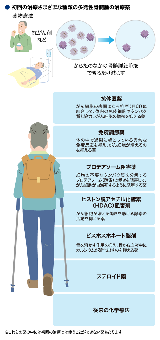 薬物療法は、抗がん剤などを使ってからだの中の骨髄腫細胞をできるだけ減らすことで、症状の改善を図る治療です。